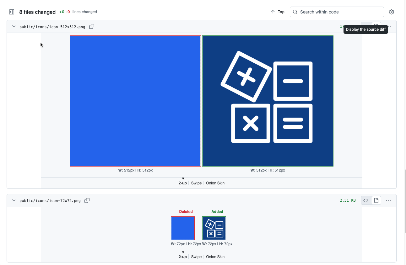 L’application fut construite avec un caractère de police icône sous forme de calculatrice en guise de logo. Or, nous avons fait faire un logo par IA générative pour mettre dans le manifeste et voir lorsqu’on sauvegarde sur l’écran d’accueil. Pourquoi ne pas pousser plus loin l’affichage de l’image de marque de notre application en intégrant le logo dans le rendu de l’écran principal? Le gabarit de l’application a donc été changé pour mettre le logo. C’est l’intégrateur qui l’a fait.