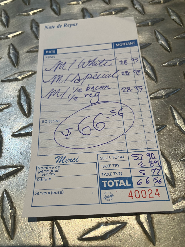 Et là c’est le temps de payer. Je sors ma carte de crédit et on me dit que seulement les paiements comptant sont acceptés. Tout d’un coup je me sens reculer dans le temps de 30 ans. Je reconnais les pratiques d’Amelios qui n’ont pas changées avec Amelias, la nouvelle génération de cette fabuleuse pizzéria. Heureusement, j’avais de l’argent liquide sur moi, ce qui est très rare en 2025. Et là, la jeune serveuse fait ma facture, à la main sur un bloc d’additions de restaurant (voir Figure 1). Elle sort sa calculatrice et calcule d’abord la TPS, puis la TVQ et finalement le total. C’est ce qui a été l’étincelle du sujet de cet article : pourquoi ne pas construire une application web progressive, qui pourra fonctionner sans accès à Internet et calculera les taxes de vente du Québec?