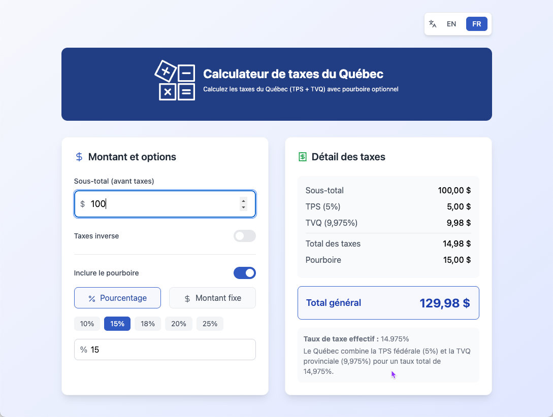 Comme j’avais déjà dans ma besace de multiples versions d’applications qui calculent les taxes de vente, lors de mon premier prompt je me suis dit, poussons un peu plus loin et demandons à ce que l’application puisse permettre optionnellement d’ajouter le pourboire.