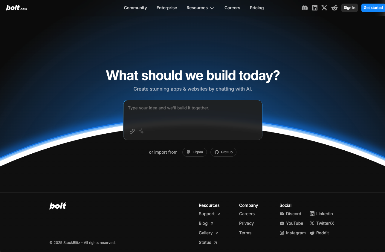 J’étais en rencontre Zoom avec mon développeur full stack/devops et lui ai dit : « Tiens, on va essayer ça pour le fun ». J’ouvre donc Bolt pour lui montrer, et je réponds très succinctement à la question What should we build today? sur son écran d’accueil :